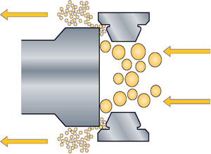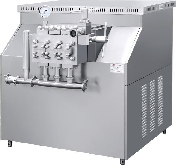 生產(chǎn)型均質機主要工作是通過柱塞往復運動將被加工物料以高壓的形式送至均質閥,使物料流經(jīng)閥頭與閥座間微小的隙瞬受到湍流、空穴、撞擊、剪切等復合的作用,將原先粗糙的乳濁液或懸浮液加工成極細微的、均勻穩(wěn)定的液與液相混乳化物或液與固分散物。